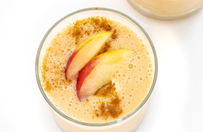 - Serve & Enjoy: Divide between two glasses. Top with cinnamon and a couple slices of peach for garnish. Serve immediately and enjoy!