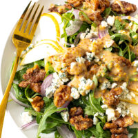 This Pear Salad is loaded with delicious textures and flavors. It's everything you'd want in a salad! Juicy pear is paired with tangy blue cheese, crunchy candied walnuts, and fresh spinach for a salad that’s anything but boring. A drizzle of homemade honey mustard dressing ties everything together, creating the perfect side dish or a light lunch.