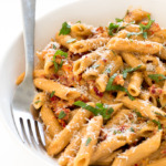 This recipe is different than the traditional penne alla vodka. I use sun dried tomatoes AND tomato paste in the sauce. They both add so much flavor! The key to making this the best penne alla vodka recipe is the tomato paste! It thickens up the sauce and adds SO MUCH FLAVOR compared to using fresh tomatoes or canned. You also don’t have to simmer the sauce for as long to get it thick which means you could be eating this in no time!