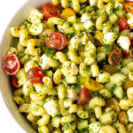 Fresh and packed with flavor, this Pesto Pasta Salad is the perfect side or light main dish for hot summer days. With a homemade pesto tossed with pasta, tomatoes, cucumbers, and mozzarella pearls, it’s a satisfying salad that’s so easy to throw together for picnics and potlucks!
