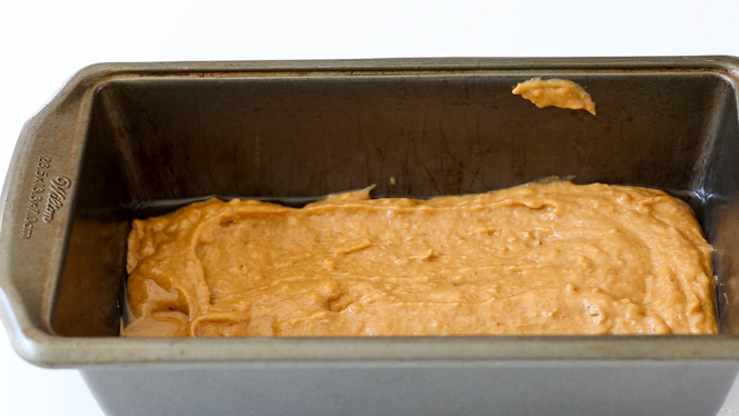 - Add dry ingredients: Fold in the pumpkin spice, flour, baking powder, baking soda, salt just until just combined. Make sure not to over mix the batter. This will made the bread dense and chewy instead of light and fluffy.
