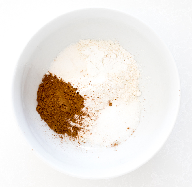 - Whisk together flour, sugar, baking powder, pumpkin pie spice and salt, set aside.