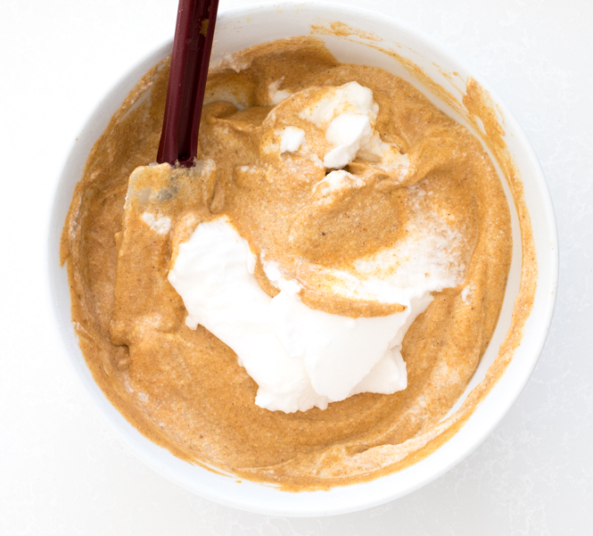 - Combine batter: Add the dry ingredients into the wet ingredients and mix just until combined. Mix half of the whipped egg whites into batter. Then gently fold in the remaining egg whites making sure not to over mix. (It’s ok if you still see strips of egg whites).