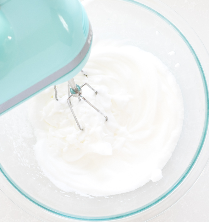 - Whip egg whites: Separate the egg yolks from the egg whites. Add the egg whites to a medium bowl and whip on high speed until stiff peaks form.