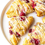 These Raspberry Scones are bursting with juicy berries in every bite! They’re so easy to whip up in the food processor and come together in just about 30 minutes, making them perfect for a quick breakfast or afternoon treat. Drizzle them with a sweet almond glaze for a sweet treat you won’t be able to resist.