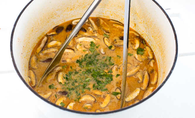 • Stir in coconut milk and mushrooms. Cook for 3-4 minutes or until mushrooms are tender. Add the cooked shrimp back to the pot along with the lime juice and cilantro. Stir to combine and serve immediately.