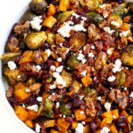 Give your holiday spread a twist with this flavorful Roasted Brussels Sprouts and Sweet Potatoes medley! Roasted Brussels sprouts and sweet potatoes are tossed with crispy bacon, cranberries, feta, candied walnuts and a drizzle of balsamic reduction. It’s the perfect sweet and tangy side dish to add to your holiday table!
