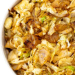 Overhead shot of sauteed cabbage served in a white bowl.