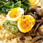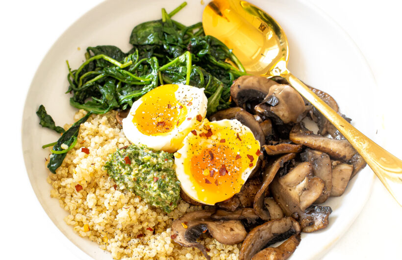 - To assemble the bowls start by adding 1/2 cup of quinoa to each bowl. Then divide the mushrooms and spinach between the two bowls. Top each bowl with a peeled jammy egg, pesto and a sprinkle of salt, pepper and red pepper flakes. Enjoy!