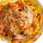 - Cook & Serve: Cook on high for 2-3 hours or until the chicken reaches 165 degrees. Top with fresh basil and serve immediately over pasta and enjoy!