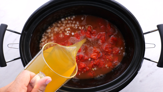 - Add sausage, garlic, onion, tomatoes, chicken broth, bay leaves, Italian seasoning, garlic powder, onion powder and crushed red pepper flakes to a slow cooker.