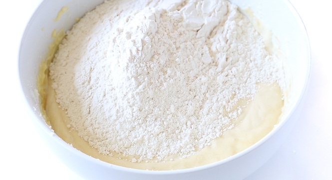 - In a medium bowl combine flour, baking powder, baking soda and salt.On low speed add the dry ingredients to the stand mixer and mix just until combined. Do not over mix.