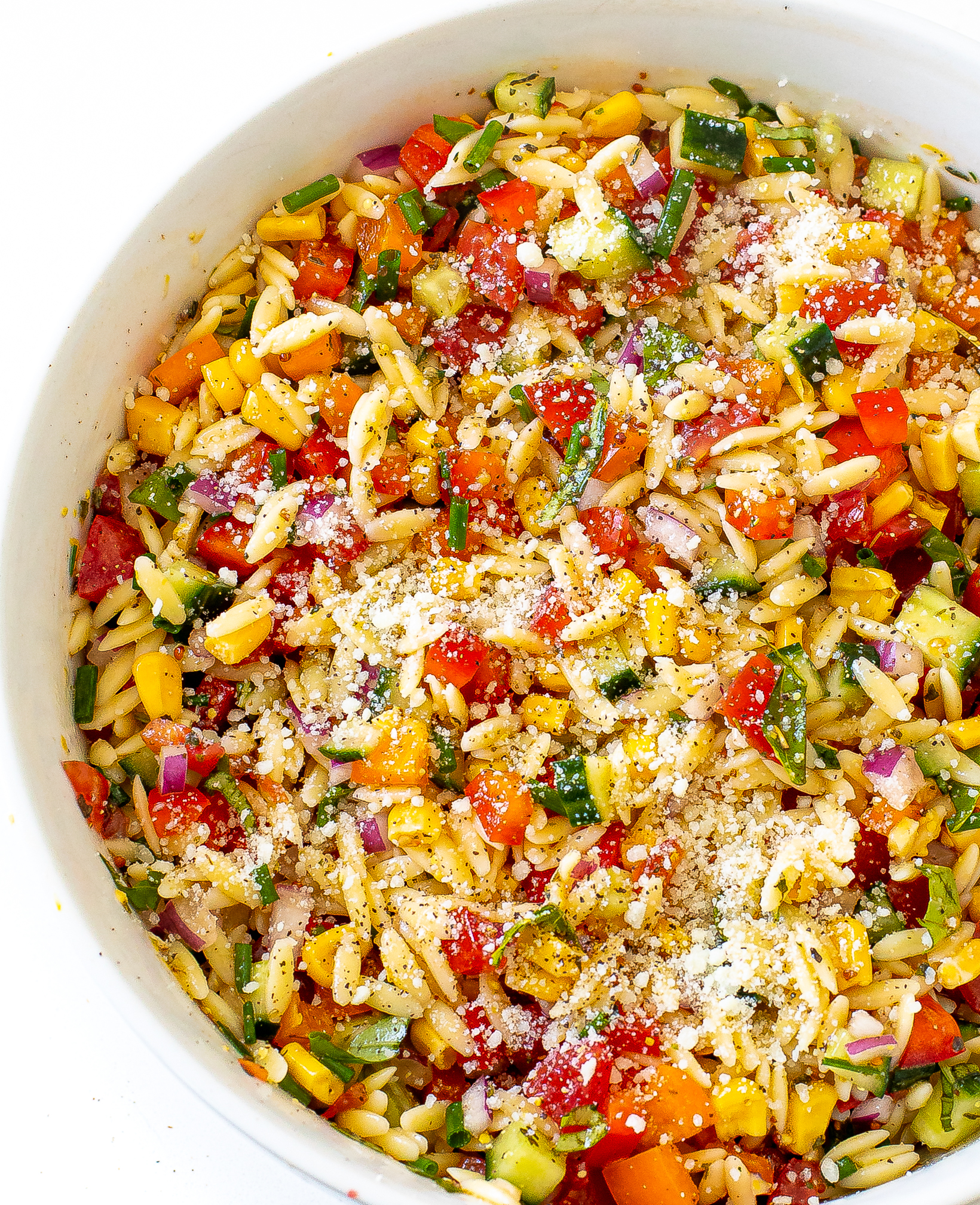 - Pour the dressing on to the orzo salad and toss to coat everything in the dressing.Serve immediately with parmesan cheese on top or store in the fridge for up to 4 days!