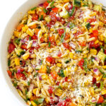This salad has all the best summer veggies in it, too! From bright red tomatoes to fresh corn and crisp cucumbers, you can really take advantage of summer’s most beautiful produce. Make this summer orzo pasta salad for a simple lunch with a protein like grilled chicken or air fryer salmon, or as a side dish with all of your favorite barbecue dishes!