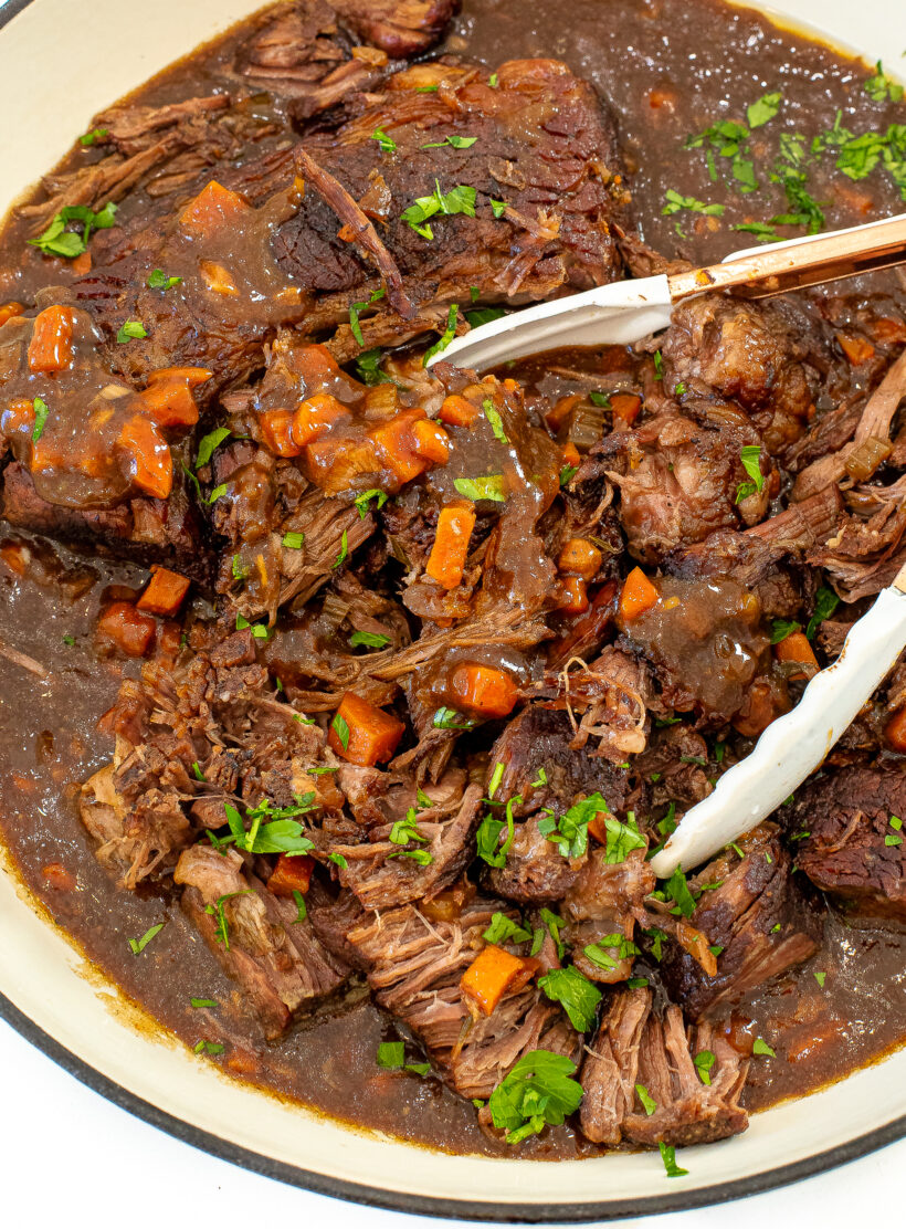 The low and slow method makes this pot roast extra fall-apart tender and flavorful. I used the same method as my Slow Roasted Beef Brisket. It is SO good!