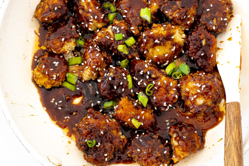 This chicken is so easy to make! Start by breading your chicken with flour, bake in the oven for 15 minutes. While the chicken bakes work on the sauce, then toss with the cooked chicken and enjoy.