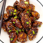 While I know ordering take-out is always an easy weeknight meal solution, I guarantee this recipe is simple enough to make in your own kitchen (and healthier, too). Plus, it takes less time than waiting for delivery! You will be eating these delicious, sweet and spicy chicken bites in less than 30 minutes. Whip up the sauce while the chicken is cooking in the oven, toss everything together and serve!