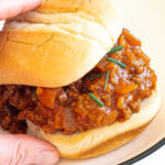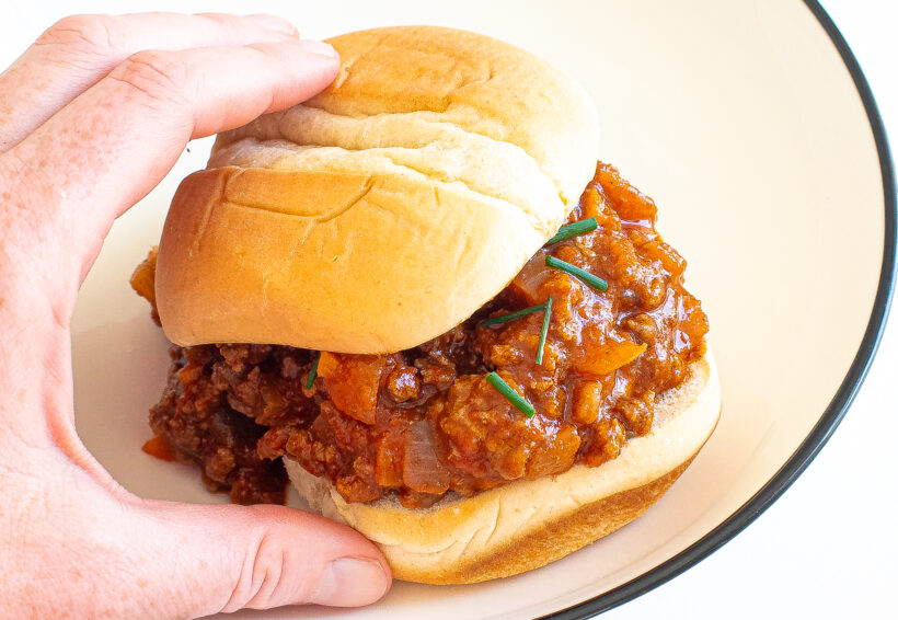 Hand holding a sloppy joe served on a white plate.