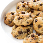 This is my new favorite chocolate chip cookie recipe! These chocolate chip walnut cookies are super soft and chewy, ultra thick, buttery and loaded with tons of walnuts and chocolate chips. They are firm around the edges and gooey in the center. They melt in your mouth when they are hot out of the oven! The secret to these cookies is the cornstarch which makes them perfectly soft and chewy. I also substitute some of the granulated sugar with light brown sugar. This produces a chewier cookie with lots of flavor.