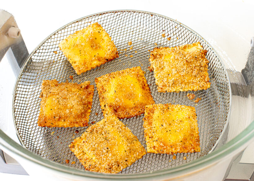 Yes absolutely! I would cook these in the air fryer at 375 for about 4 minutes a side. Make sure to spray both sides of the ravioli with cooking spray. This will help to crisp it up.