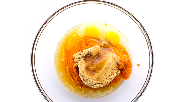 - Add the cooled butter to a large bowl along with the pumpkin puree, brown sugar, eggs, buttermilk and vanilla.