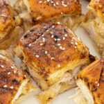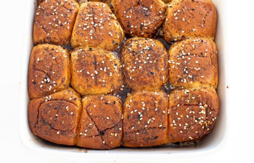 - Brush the butter mixture on top of the rolls. I like the brush some along the sides as well. (If there is any extra left lift up the top of the rolls and pour it on top of the cheese slices).Sprinkle the top of the rolls with everything seasoning.