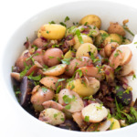 The BEST Warm German Potato Salad Recipe loaded with crispy bacon, tender baby potatoes, red onions, a tangy dressing and tons of fresh herbs! This hot german potato salad makes a great side dish to serve alongside Grilled Chicken Breast, Steak, or Pork!