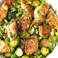 Combine soy sauce, rice vinegar, sesame oil, sugar, garlic and crushed red pepper flakes in a small bowl. Whisk to combine.Pour asian dressing on to the cucumbers and edamame and toss to combine, set aside until your ready to toss with the dumplings.
