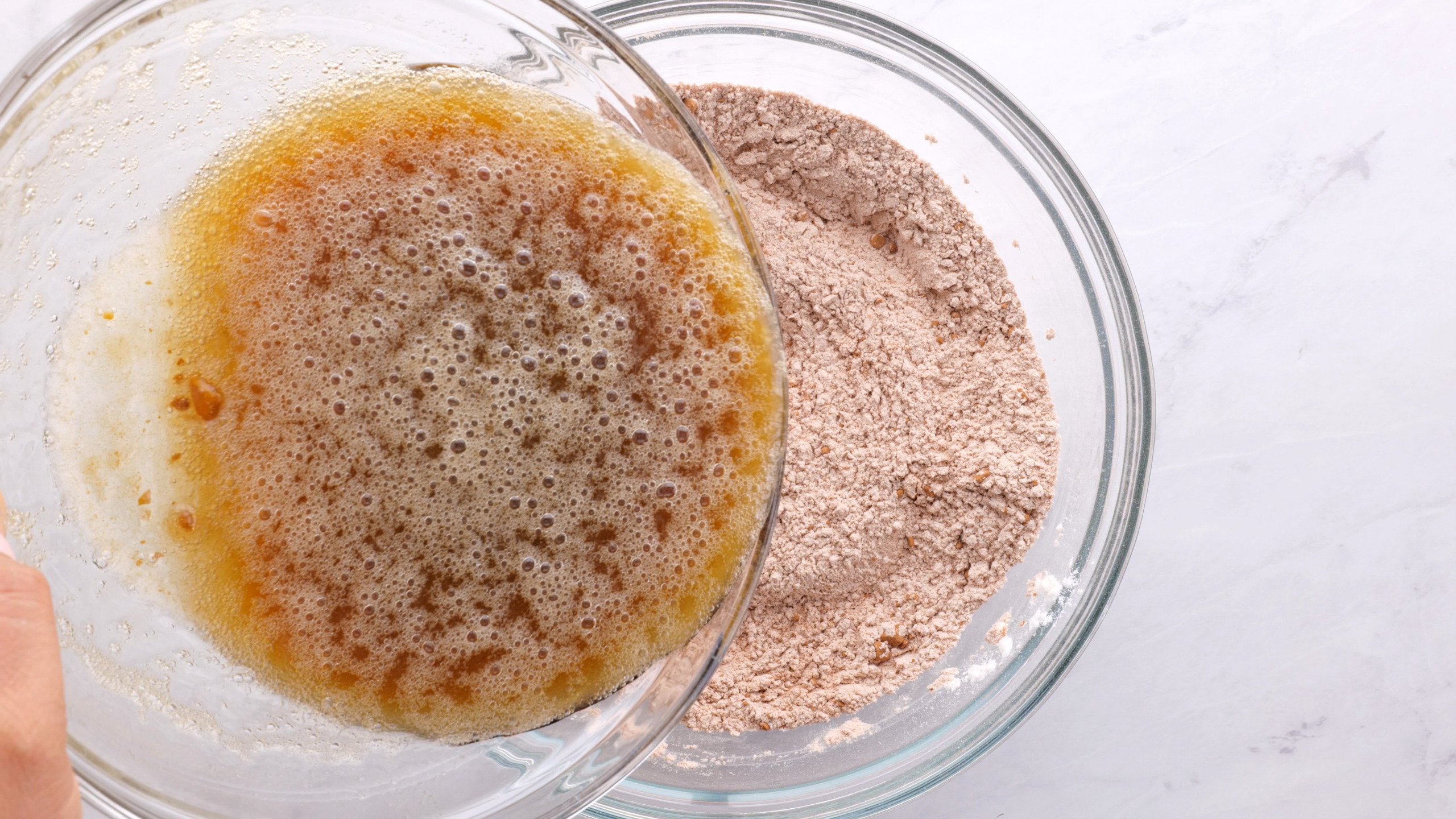 In a medium bowl combine both sugars, vanilla, vinegar, oil and coffee.